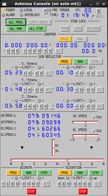 asteobs@aste-1c: cosmos3/naoj/sbin/dasbox_sw restart DASBOX - restart /cosmos3/naoj/bin/tap_lt1500.py lantap2 1 off POS=100,100,000,100 POF1 POS=000,100,000,100 sleep 30 /cosmos3/naoj/bin/tap_lt1500.py lantap2 1 on POS=000,100,000,100 PON1 POS=100,100,000,100 sleep 180 /cosmos3/naoj/sbin/prebox Ch 0 Gain:5 (+- 0.312 V) ... Ch 10 Gain:1 (+- 5.000 V) Ch 11 Gain:1 (+- 5.000 V) Ch 12 Gain:1 (+- 5.000 V) Ch 13 Gain:0 (+- 10.000 V) ... Ch 15 Gain:0 (+- 10.000 V) Gain set PREBOX Cutoff set PREBOX asteobs@aste-1c: